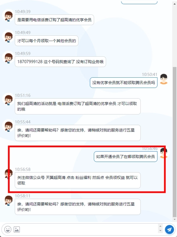 客服还说了如果用户开通了会员后,就可以关注微信公众号天翼超高清点击粉丝福利然后点会员领权益就可以领取