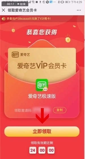 3、好友即可点击刚刚分享的链接,点击立即领取,再打开爱奇艺极速版,通过验证后点击立即领取即可获得vip了。